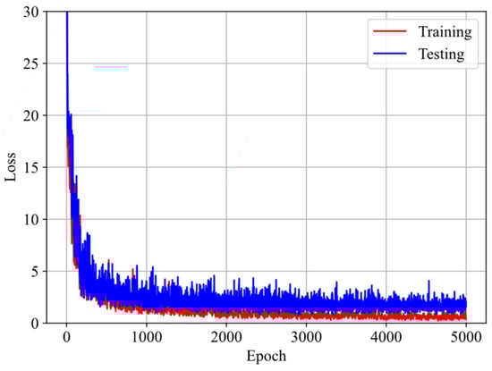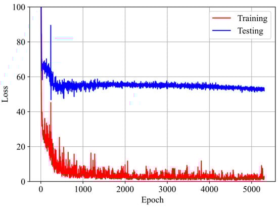 Figure 5 illustrates the evolution of loss with respect to epoch during training and testing. It is observed that the loss decreases dramatically at first and then stabilizes at a steady state. Additionally, the testing loss is slightly higher than the training loss. These observations suggest that the model does not suffer from overfitting or underfitting issues.