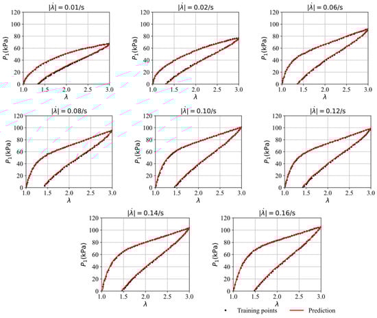 Figure 6 compares the stress–stretch curves from the training data with the model’s predictions at different stretching rates after 5000 epochs. It was observed that the loss value of the training data stabilizes around 0.50 after approximately 5000 epochs through trial and error. Therefore, we trained the model for 5000 epochs. To evaluate the model’s accuracy under various conditions, the root mean square error (RSME) is employed, defined as , where and represents the ground truth and the predicted values. The RMSE quantifies the discrepancy between the predicted results and the training or testing data. RMSE values for all cases in this work are listed in Table 2. For the stretching rates of = 0.01/s, 0.02/s, 0.06/s, 0.08/s, 0.12/s, 0.14/s, and 0.16/s, the corresponding RMSE values are 0.76 0.56, 0.53, 0.71, 0.85, 0.83, 0.73, and 0.63, respectively. The predictions from the GRU–FNN model are highly consistent with training data, and the hysteresis curves exhibit typical viscoelasticity.