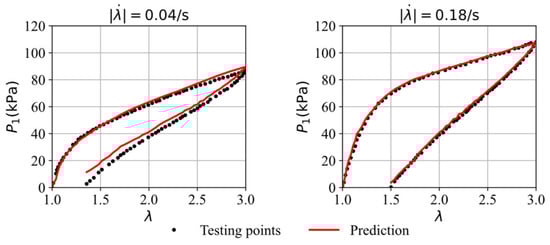 Figure 7 compares the stress–stretch curves from the testing data with the model’s predictions at two different stretching rates after 5000 epochs. For the stretching rates of = 0.04/s and 0.18/s, the corresponding RMSE values are 3.41 and 1.52, respectively. The testing data, which was not used during the training process, is accurately predicted by the trained model, demonstrating the GRU–FNN model’s strong generalization capabilities in predicting viscoelastic behaviors. The parameter values (weights and biases) here after 5000 epochs are saved for use as initial parameters in training the GRU–FNN model on experimental data.