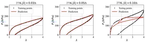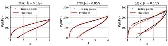 To address the overfitting issues associated with scarce data, the parameter values from training the GRU–FNN model with theoretical data are used as the initialization for training on the experimental data. Figure 10 shows the evolution of the loss with respect to epochs during both training and testing. It is evident that the gap between the loss for training and testing data has significantly narrowed compared to Figure 8. Given that the theoretical data were trained for 5000 epochs, the experimental data were trained 300 epochs to maintain consistency in the total training duration (5300 epochs). Figure 11 compares the stress–stretch curves from the experimental data with the model’s predictions at 273 K after 300 epochs. It was also observed that the loss values of training data and testing data stabilize after approximately 300 epochs through trial and error. For the stretching rates of = 0.03/s, 0.05/s, and 0.10/s, the corresponding RMSE values are , , and , respectively. The high degree of consistency between the predicted and experimental stress–stretch curves indicates that our approach has effectively alleviated the overfitting issues.