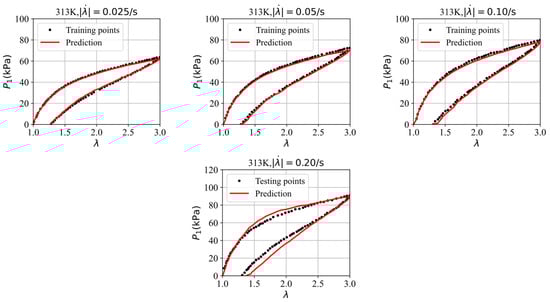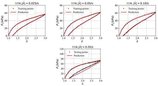 Finally, we split four datasets, selected from the stress–stretch curves at four different stretching rates, i.e., 0.025/s, 0.05/s, 0.10/s, and 0.20/s in the experiments of VHB4905 samples with dimensions of 130 mm × 10 mm × 0.5 mm [42], into three training datasets and one testing dataset to further assess the GRU–FNN model’s capabilities in predicting the viscoelasticity of materials across different temperatures. The saved parameter values from training with theoretical data are used for initialization. Figure 12 shows the evolution of the loss with respect to epochs during training and testing at 313 K. It can be seen that the gap of the loss during training and testing is smaller than that observed in Figure 9 due to the inclusion of an additional training dataset. Figure 13 compares the stress–stretch curves from the experimental data and the model’s predictions at 313 K after 300 epochs. For the stretching rates of = 0.025/s, 0.05/s, 0.10/s, and 0.20/s at 313 K, the corresponding RMSE values are 0.81, 1.32, 1.72, and 4.55, respectively. Figure 14 shows the evolution of the loss with respect to epochs during training and testing at 333 K. The evolution trend is similar with that in Figure 12. Figure 15 compares the stress–stretch curves from the experimental data and the model’s predictions at 333 K after 300 epochs. At 333 K, for the same stretching rates, the RMSE values are 0.24, 0.31, 0.53, and 4.27, respectively. The model accurately predicts the training data and provides reasonable predictions for the testing data, demonstrating improved generalization capabilities.