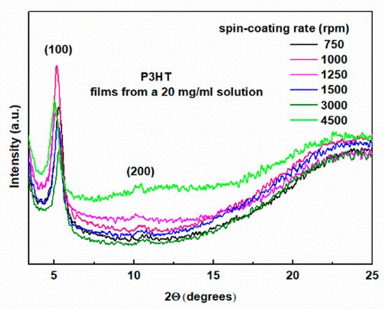 This conclusion is further supported by the known fact that P3HT films prepared from chlorobenzene solution on a glass substrate crystallize in edge-on configurations [21]. Such orientation is favorable for conduction in the direction parallel to the layer surface, which coincides with the π–π stacking direction. Moving on to the discussion of the effect of the spin-coating rate on the morphology of the layers, we can see that with the increase of the spin speed, there is a clear decrease in the intensity of the (100) peak, in agreement with [27]. These changes are accompanied by a clear increase in the amorphousness of the layers, visible in the form of growing broad diffraction bands superimposed on the glass substrate background. This tendency is clearly visible in both of these figures. The difference is that for the layers obtained from the 20 mg/mL solution, these changes are limited to 2Θ of about 25 degrees. On the other hand, these changes for the layers shown in Figure 3 cover a larger range and are visible for 2Θ reaching 30 degrees. Importantly, such behavior was not observed in [27]. More detailed information is provided by the quantitative analysis of the (100) peak, the results of which are presented in Table 1 and Table 2 for the films from 20 mg/mL and 40 mg/mL solutions, respectively. As can be seen, the position of the (100) peak is within the range of 2Θ angles from 5.02 to 5.38 degrees for all the films. This corresponds to inter-planar spacings of 17.6 to 16.4 Å, and this parameter does not correlate with the spin rate. In contrast, the half-widths of this peak range from 0.480 to 0.548 degrees. However, the FWHM values for the films deposited from a 20 mg/mL solution are smaller than those obtained from a 40 mg/mL solution.