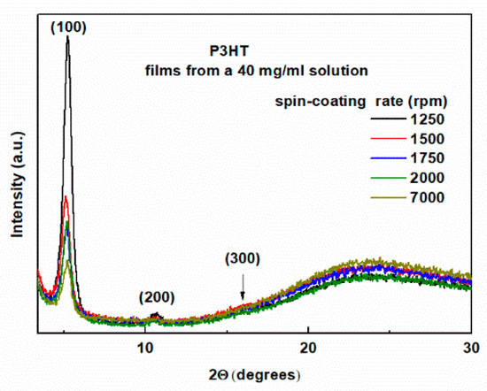 XRD patterns of P3HT thin films deposited from 40 mg/mL solution concentration with indicated spin-coating rates.