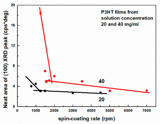 The neat area of (100) peak as a function spin-coating rate for P3HT thin films deposited from 20 and 40 mg/mL solution concentration.