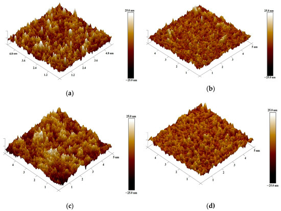 The surface morphology of the layers was determined by atomic force microscopy (AFM). Due to the relatively large number of samples studied, surface images on a scale of 5 μm × 5 μm are shown in Figures S2a–h and S3a–f in the Supplementary Materials (SM). Here, in Figure 4, a comparison of surface images for only the thickest and thinnest layers is presented.