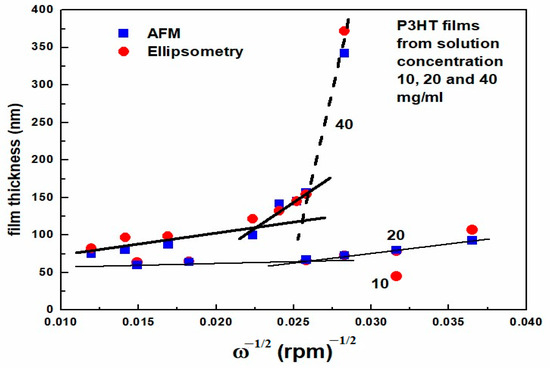 Thickness of the films determined in AFM and ellipsometry studies as a function of ω−1/2.