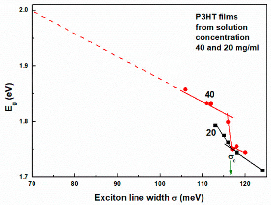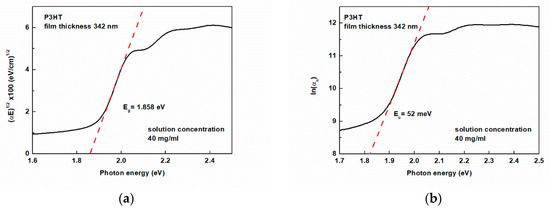 The interpretation of the results includes the determination of the energy gap, Eg, the Urbach energy Eu, the exciton bandwidth W and the exciton linewidth σ. The methods for determining the values of these physical quantities are well-known and widely described in the literature, e.g., see references [50,51] for the determination of Eg and Eu and references [52,53,54] for W and σ and references therein. The transmittance of the studied films deposited from solutions with concentrations of 20 and 40 mg/mL are shown in Figures S5a and S5b, respectively. In general, the absorption spectra show the typical P3HT thin film shape of absorption bands. A distinct exciton peak at photon energy c.a. 2.05 eV and accompanying vibronic band maxima are visible.