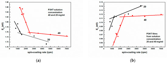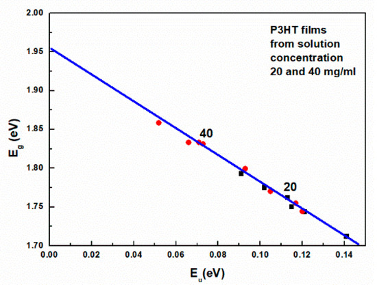 The presence of these states is visible in the form of an exponentially decaying so-called Urbach tail, which is visible for energies higher than Eg. The observed decrease in Eg with increasing spin-coating rates has the same cause and results from the mutual correlation of both these quantities. Indeed, this is clearly visible in Figure 8, which shows Eg as a function of Urbach energy. As a test of the correctness of the analysis, one can read from this figure the extrapolated value of Eg = 1.96 eV for the layer with zero Urbach energy. This value should be close to the HOMO-LUMO energy difference.