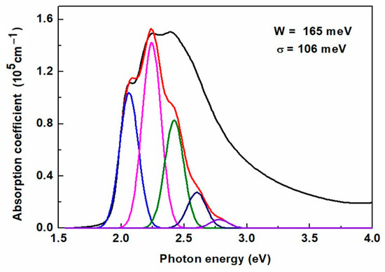 More precisely, this theory allows calculating the absorption spectrum of aggregates as a sum of vibronic bands having the shape of Gaussian lines with the same broadening σ, also referred to as exciton line width. Compared to the experimental data, this approach gives an estimate not only of the values of W and σ but also of the percentage share of aggregates in the layer [52]. An example of applying this approach to the absorption coefficient of the thickest layer is shown in Figure 9, and the aggregate contribution is indicated by the red contour. As can be seen, the fit is not perfect. The amplitudes of the first two peaks are slightly too high. However, considering that only two parameters are fitted to a part of the spectrum, and W is the ratio of the amplitudes of the two peaks, this discrepancy is acceptable.