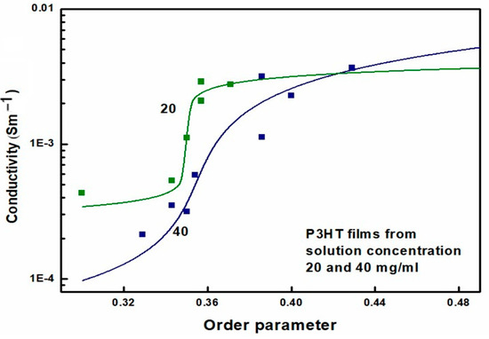 Electrical conductivity measurements were performed on all tested films with two silver paste contacts. The average distance between the contacts was 1 mm, and their width was 3 mm; therefore, the geometric factor was assumed to be equal to 3. Due to the high resistance of the layers, the two-probe measurement is sufficiently accurate. The specific resistance of the layers was determined from the current-voltage characteristics using the layer thicknesses determined from AFM studies. The final results of applying Equation (2) to the experimentally determined electrical conductivity of P3HT layers are shown in Figure 12. In this figure, the lines represent a 4-parameter fit of Equation (2) to the experimental data. Three of these parameters have a clear physical interpretation. Namely, the values of Σc and Σr are the extrapolated values of Σ for the limiting values of x, while xc is the value of x at the onset of percolation. The values of xc obtained from GEMT, i.e., Equation (2), are 0.35 and 0.355 for P3HT films obtained from 20 and 40 mg/mL solutions, respectively. In comparison, the critical value of the order parameter determined from optical measurements ranges from 0.343 to 0.357. Thus, the agreement of the critical value of xc determined by both methods is good.
