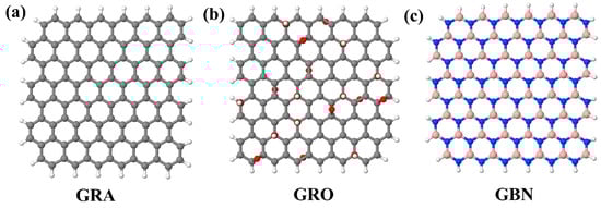 Chemical structure of the molecules of (a) graphene (‘GRA’), (b) graphene oxide (‘GRO’), and (c) hexagonal boron nitride (‘GBN’).