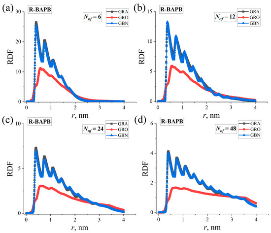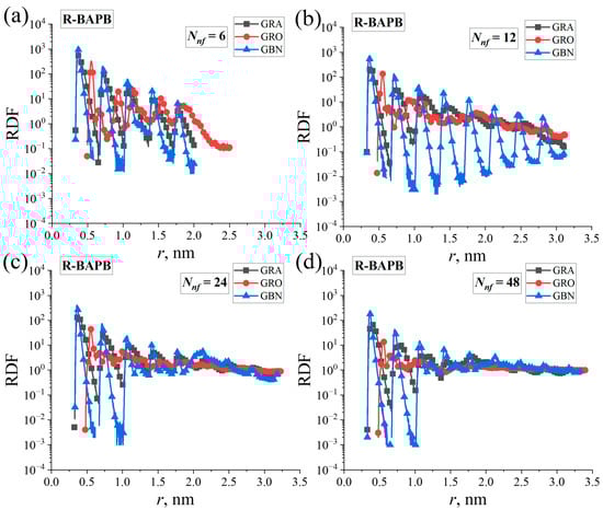 Intermolecular radial distribution functions (RDFs) of the atoms of graphene (‘GRA’), graphene oxide (‘GRO’), and hexagonal boron nitride (‘GBN’) molecules in PI nanocomposite systems based on R-BAPB for various numbers of Nnf: (a) 6, (b) 12, (c) 24, and (d) 48 nanofiller molecules.