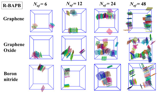 In order to substantiate this hypothesis, the immediate structures of the polyimide nanocomposites were examined at T = 800 K. Figure 5 shows the instantaneous configurations of graphene, graphene oxide, and boron nitride nanoparticles with various numbers of Nnf molecules only in the R-BAPB nanocomposites. Similar instantaneous configurations of these nanoparticles in BPDA-P3 and ULTEMTM nanocomposites are shown in Figures S9 and S10 in the Supplementary Materials.
