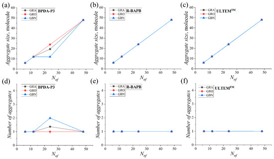 Average number of nanofiller molecules per aggregate (a–c) and average number of aggregates (d–f) as a function of the number of graphene, graphene oxide, and hexagonal boron nitride molecules in the polyimide nanocomposites at T = 800 K.