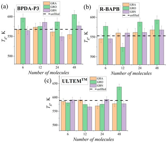 The glass transition temperature Tg of the PI nanocomposites based on PIs (a) BPDA-P3, (b) R-BAPB, and (c) ULTEMTM at various number of graphene (‘GRA’), graphene oxide (‘GRO’), and hexagonal boron nitride (‘GBN’) molecules. The horizontal dashed lines indicate the values of Tg of the unfilled PIs [49].