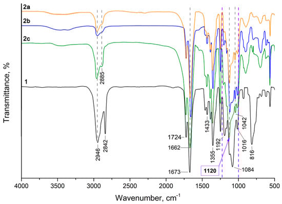 The chemical structure of polysilsesquioxanes 2ac obtained by hydrolysis and condensation of precursor 1 in water at pH 7 or in acidic or alkaline medium in the presence of HCl (pH 3) or NaOH (pH 10) was characterized by Fourier-transform infrared spectroscopy (Figure 2). In general, the spectra of compounds 2ac are almost identical. The absorption bands at 1192 and 816 cm−1 corresponding to the methoxysilyl groups of the initial monomer 1 disappeared, confirming the completion of the hydrolysis reaction [41]. The broad absorption band at 3376 cm−1 was stretching vibrations of residual associated Si–OH groups. During hydrolysis and condensation, the glutarimide group remains unaffected. This is evidenced by absorption bands at 1722 cm−1s C=O) and 1662 cm−1as C=O) and 1460–1435 cm−1 and 1387–1353 cm−1 (C–C bond deformation vibrations of the glutarimide ring). Compared to the FTIR spectrum of 1-[3-(trimethoxysilyl)propyl]-piperidine-2,6-dione, the absorption peaks of the C=O group at 1724 and 1673 cm−1 are shifted to the low-frequency region by 2 and 11 cm−1 in samples 2ac.