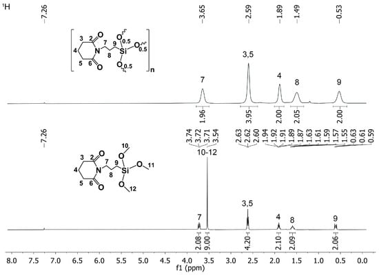 Figure 3. 1H NMR spectra of 1-[3-(trimethoxysilyl)propyl]piperidine-2,6-dione (down) and 1-[3-(silsesquioxanyl)propyl]piperidine-2,6-dione (2a) (up).