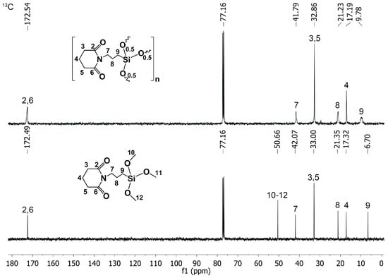 Figure 4. 13C NMR spectra of 1-[3-(trimethoxysilyl)propyl]piperidine-2,6-dione (down) and 1-[3-(silsesquioxanyl)propyl]piperidine-2,6-dione 2a (up).