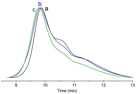 Figure 5. GPC curves of silsesquioxanes 2ac: a—pH 7, b—pH 3, and c—pH 10.