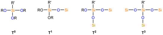 The degree of condensation of silicon atoms is determined by the number of siloxane bonds. According to the literature [30,39,40], there are four types of silicon atoms: T0, T1, T2, and T3, depending on their degree of condensation (Figure 6). The degree of condensation of silicon atoms without siloxane bonds is designated as T0. Silicon atoms with one siloxane bond are designated as T1, while silicon atoms with two siloxane bonds are designated as T2. The designation of T3 corresponds to completely condensed silicon atoms, which have three Si–O–Si bonds.