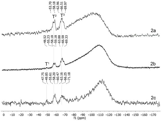 The 29Si NMR spectra of the synthesized silsesquioxanes 2ac are shown in Figure 7. Each spectrum exhibits chemical shifts in the region from –53 to –60 ppm and from –61 to –71 ppm, corresponding to the structural units T2 and T3 [31]. The 29Si NMR spectra of the polymers 2b and 2c show peaks in the range of –46 to –50 ppm that can be assigned to T1 species. The chemical shift of the monomer 1 at –42.4 ppm is missing.