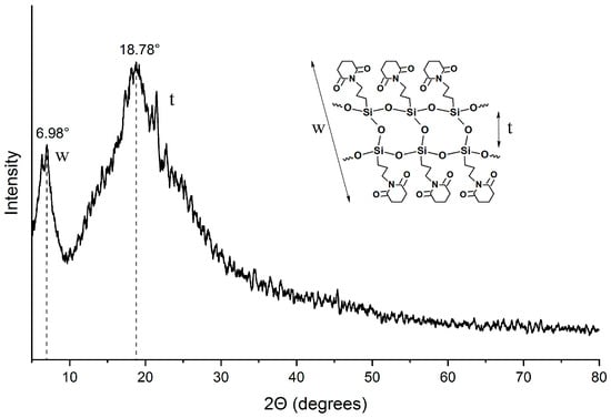 The powder X-ray diffraction method was used to study the 1-[3-(silsesquioxanyl)propyl]piperidine-2,6-dione 2a structure. The X-ray diffraction pattern of silsesquioxane 2a demonstrates two distinct characteristic diffraction halos, which is in good agreement with the literature data regarding the structure analysis of the ladder polymers by XRD (Figure 8) [44,45,46,47,48]. The first halo (w) at 2θ = 6.98° indicates the intramolecular chain-to-chain distance, corresponding to the width of a double-chained molecule of ladder organosilicon polymers. The 1-[3-(silsesquioxanyl)propyl]piperidine-2,6-dione 2a is amorphous, but the narrow and sharp diffraction peak (w) with high intensity indicates that the polymer has a relatively regular ladder-like skeleton, the rigidity of which limits movement around the longitudinal axis. The second diffuse halo (t), covering a wide range of diffraction angles with a maximum at 2θ 18.78°, corresponds to the average thickness of the ladder-like polymer chain. The average thickness of the macromolecular chain of polysilsesquioxane 2a was found to be at 4.72 Å, and the distance between two glutarimide side-chain groups through the siloxane backbone of the ladder structure was 12.65 Å.