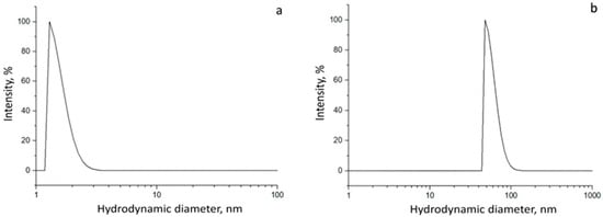 The obtained histograms of the dependence of the signal intensity on the hydrodynamic diameter in aqueous and water-salt media indicate that silsesquioxane 2a forms a colloidal system with a monomodal particle size distribution (Figure 9).