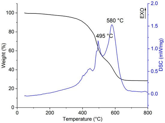 The polysilsesquioxane 2a thermal properties were characterized by thermogravimetric analysis and differential scanning calorimetry in an oxidative atmosphere, the results of which are given in Figure 11. TGA data show that silsesquioxane 2a is stable up to 335 °C (Td5), after which weight loss started, associated with thermal oxidative degradation. The pyrolysis temperature of PSQ-GI 2a with a weight loss of 10% was 405 °C. This is due to the presence of thermally stable glutarimide side-chain groups and the Si–O–Si siloxane bond framework. The initial weight loss of the sample can be explained by the removal of water. The unreacted OH groups present in product 2a condense, resulting in an increase in the degree of cross-linking. Weight loss associated with thermal oxidative destruction is characterized by two main stages. The first degradation stage with a 37% weight loss in the range from 405 °C to 524 °C is attributed to the thermal decomposition of the organic side chain groups of the silsesquioxane. In this case, an exothermic peak with a maximum at 495 °C is observed on the DSC curve. The mass loss is accompanied by peaks in the ion current curves with mass numbers corresponding to low-molecular-weight products of thermal oxidative degradation with m/z 12 (C), 28 (CO), 30 (NO, CH2O), 42 (NCO), and 44 (CO2) (Figure 12).