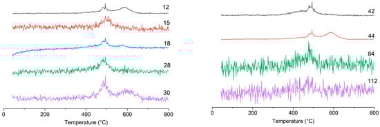 Products with high m/z 80, 81, 84, 111, 112, and 113 in the mass spectrum are also identified, which probably corresponds to the cleavage of the N–C bond and elimination of the glutarimide fragment. The second degradation stage in the temperature range of 540–660 °C with a maximum at 580 °C and with 21% weight loss was caused by the pyrolytic decomposition of glutarimide groups, oxidation of free carbon, and thermal degradation of the Si–O–Si main chain. Thermal degradation of the Si–O–Si backbone was mainly caused by a random cleavage reaction in which an oxygen atom recombined with a non-adjacent silicon atom within the same backbone to form volatile cyclic oligomers [50]. The mass loss is accompanied by peaks in the ion current curves with m/z 12 (C), 30 (C2H6), and 44 (CO2) (Figure 12). The residual mass of 28% can be attributed to SiO2 and char formed during complete decomposition of the polymer.