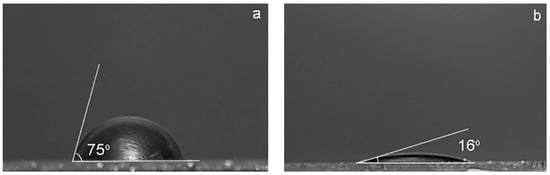 A polymer film coating based on silsesquioxane 2a was obtained and deposited on a flat glass substrate using the drop-casting method. Contact angle analysis was used to evaluate its surface properties. Figure 13a shows a photograph of a water droplet (2 μL) deposited on the surface of a PSQ-GI polymer film coating on silicate glass. The contact angle of water was 75°. This value is greater than that for deposited on untreated silicate glass (Figure 13b), but less than 90°, that is, the obtained PSQ-GI polymer film coating belongs to hydrophilic materials.