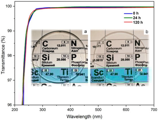 The transmittance of the polymer film coating was measured by UV-Vis spectroscopy. The transmission spectra of the polymer film coating after different irradiation times were used to investigate its resistance to UV radiation (Figure 14). The initial transmission spectrum of the film coating showed a high transmission (98%) in the visible wavelength range and in the near ultraviolet region of the spectrum. In the ultraviolet region of the spectrum below 277 nm, the transmittance was reduced due to the absorption of UV radiation by the chromophoric carbonyl groups of the glutarimide moieties of silsesquioxane 2a. During UV irradiation for 24 h, there were no significant changes in the transmittance of the film coating. This is probably due to the fact that glutarimide fragments act as a UV-absorbing material that protects against ultraviolet radiation, effectively scattering and absorbing light in the wavelength range below 300 nm, and ultraviolet rays practically do not penetrate through the polymer coating film.