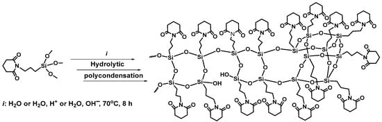 The monomer 1-[(3-trimethoxysilyl)propyl]piperidine-2,6-dione 1 was polymerized under solvent and catalyst-free conditions using deionized water (pH 7). Deionized water, which had been preliminary adjusted to have a pH of 3.0 or 10.0, was used as well. Deionized water (2 mL) was added to the monomer 1 (0.275 g, 1.0 mmol) in a single drop with stirring. After the addition, the reaction mixture became clear and homogeneous. The reaction mixture was then heated to 70 °C and maintained at this temperature for 8 h with vigorous stirring. After cooling to room temperature, a water–alcohol phase was separated using a rotary evaporator. If hydrochloric acid or sodium hydroxide catalysts were used, the following additional steps were taken to neutralize the reaction mixture: the mixture, after separating the water alcohol layer, was washed with deionized water to achieve a pH of 7 in the eluate. The remaining clear viscous substance was dried in a vacuum at room temperature for 24 h. The final polysilsesquioxanes 2ac containing glutarimide side-chain groups were obtained as colorless solids. The yield of silsesquioxanes 2ac was 78–87%, based on the ideal chemical formula for one unit of this product, [C8H12NSiO3.5, FW = 206.277]. Anal. Calc. (%) for C8H12NO3.5Si: C 46.58, H 5.86, N 6.79, Si 13.62. Found (%): C 46.02, H 5.90, N 6.28, Si 14.17. FTIR (ν, cm−1): 3376 (O–H), 2955, 2885 (CH2), 1722 and 1662 (C=O), 1457–1435, 1384–1353 (C–C, piperidine-2,6-dione ring), 1120 and 1042 (Si–O–Si). 1H NMR spectrum (400 MHz, CDCl3, δH, ppm): 3.65 (br, 2H, NCH2), 2.59 (br, 4H, CH2C(O), protons of the piperidine-2,6-dione ring), 1.89 (br, 2H, CH2CH2CH2, protons of the piperidine-2,6-dione ring), 1.49 (br, 2H, CH2CH2CH2Si), 0.53 (br, 2H, CH2Si). 13C NMR spectrum (100 MHz, CDCl3, δC, ppm): 172.54 (C=O), 41.79 (NCH2), 32.86 (CH2C(O), the piperidine-2,6-dione ring), 21.23 (CH2CH2CH2Si), 17.19 (CH2CH2CH2, the piperidine-2,6-dione ring), 9.78 (CH2Si). 29Si NMR spectrum (79.5 MHz, CDCl3, δSi, ppm, chemical shifts were assigned according to the literature [5,30,31]): −53.5 to −59.4 (T2) and −62.7 to −69.1 (T3).