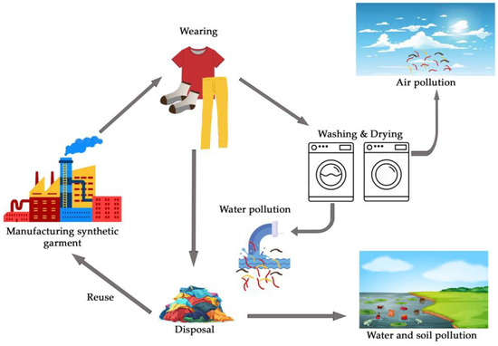 The inclination of textile materials to emit fiber fragments, especially those that are synthetic, including polyester, polyamide, and polyurethane, has become a critical environmental concern. The release of fiber fragments occurs at different stages of the life cycle of textile products, including manufacturing, wearing, washing, and disposal (Figure 1). The main factors contributing to this trend are primarily the washing process and garment care [11,12,13,14,15,16,17,18]. Due to the fabric structure, which consists of staple fibers or long, continuous filaments, the polyester surface can be broken or abraded under various mechanical impacts, resulting in the release of smaller fragments [19,20]. Once released and detached from textiles, microfiber fragments can accumulate in water bodies over days and years, potentially harming marine life and entering the food chain [17,19,20,21]. Efforts to mitigate the release of polyester fiber fragments include the development of technologies to capture microfiber fragments during the washing process, filtration systems promoting the use of laundry bags or filters, advocacy for the use of more sustainable and less shedding textile materials, and improved fabric and garment design [14,20,22,23,24,25,26]. Most tests are performed according to standards using a specific detergent, while some standards involve washing in water.