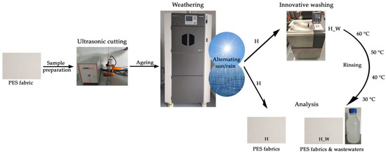 The study examined the physical, structural, and morphological attributes of untreated and aged fabrics, assessing changes that occurred before and after they were subjected to 10 washes. The wastewater produced from ten washing sessions was collected and subjected to analysis through physico-chemical parameters to investigate the effects of polyester fabric aging on the wastewater composition. Figure 2 presents a schematic depiction of the workflow.