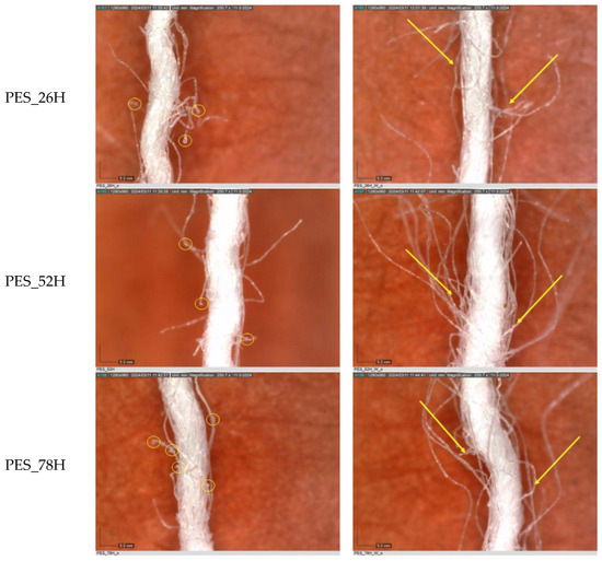 The images captured using a digital microscope at a magnification of 250× provide a clearer view of the surface of the individual warp yarns. Figure 4a shows individual yarn segments of aged polyester samples, and aged and washed samples (Figure 4b) as a function of aging time. With increasing aging time, a slight degradation of the fabric occurs; surface changes due to slight deformation of the yarn were observed (slightly protruding fibers and the local thickening of individual fibers, in particular PES_78H and PES_104H; Figure 4a). The reason for the thickening of the polyester fibers during aging is the phenomenon of “annealing” (yellow circles), in which the molecules in the polymer chains rearrange themselves, leading to changes in the structure and properties of the fiber. The molecular relaxation and rearrangement led to an increase in the thickness or diameter of the polyester fibers [55,56]. The images show a difference in the number and length of fibers protruding from the structure of the polyester fabric. The washing process leads to increased fibrillation, defragmentation, and slight deformation, as well as to a deterioration in the morphological properties of the yarn (Figure 4b). This phenomenon can be attributed to both the mechanical action involved in the washing process and the impact of the detergent on the polyester fabric. Washing polyester fabric in a detergent solution with a slight alkalinity at 60 °C promotes hydrolysis of the fibers, resulting in surface etching. This phenomenon is corroborated by the rise in fibrillation observed (Figure 4b). Additional washing causes the fibril bundles to break apart and appear on the surface of the material [55,56], negatively affecting the overall surface of the fabric.