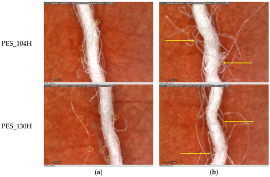 In Figure 3, untreated polyester yarn (PES_N) is compared to yarn that has been subjected to 10 wash cycles (PES_N_W). The results indicate that the polyester fabric experiences changes during washing, leading to the fibers protruding (yellow arrow) from the yarn (Figure 3b).