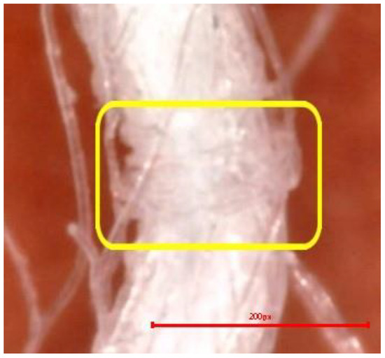 Consequently, a magnified portion of the yarn (Figure 4b) is illustrated in Figure 5, representing a structural component of the aged and washed fabric sample (PES_130H_W).