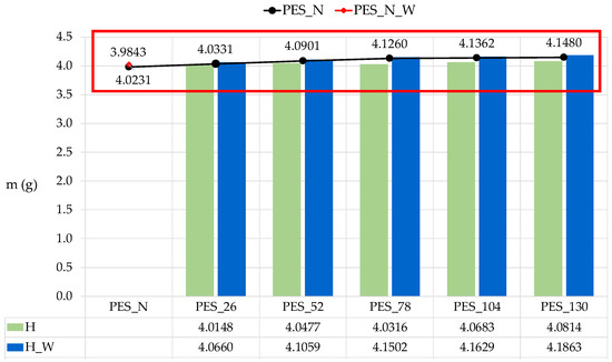 The polyester fabrics were analyzed using gravimetric methods, as the standards for microplastics originating from textiles require monitoring the material alterations of the fabrics during the washing process [60,61,62]. Figure 8 illustrates the changes in weight of the polyester fabric (PES_N) resulting from both aging and the washing process.