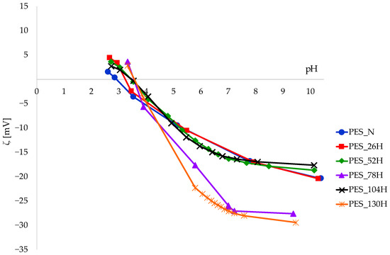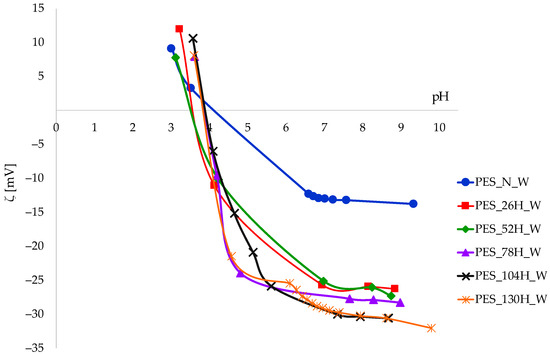 The zeta potential curves of aged samples (PES_26H, PES_52H and PES_104H) are similar to untreated polyester fabric (PES_N). The zeta potential values of samples aged 78 and 130 h are more negative compared to the untreated one. During the sun/rain cycle, the water washes away the part degraded by the sun and hydrolyses the surface of the polyester fabric, making it more accessible through the surface erosion of the layer, i.e., the hydrolysis of the ester bonds.