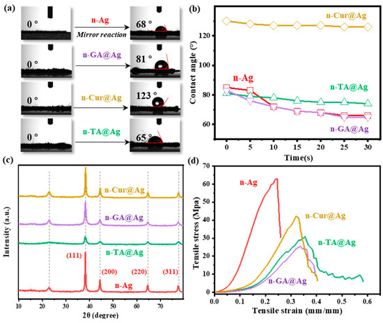 The crystalline structures and mechanical properties further elucidate the impact of the treatments on the cotton fabrics. The X-ray diffractograms are shown in Figure 3c. The characteristic diffraction peaks for Ag-doped fabrics observed at the positions of 37.8°, 44.21°, 64.20°, and 77.50° are attributed to the (211), (200), (220), and (311) planes of the fcc silver, respectively [35,36]. The samples exhibited various peak intensities, indicating that the AgNPs were successfully synthesized on the polyphenol-coated cotton fabrics via the silver mirror reactions. Moreover, it can be concluded that the Ag nanoparticles were successfully synthesized and evenly distributed on the cotton fiber surfaces by using different polyphenols as the stabilizers and coating matrixes. Compared with the n-Ag sample, the intensities of the characteristic peaks for Ag-doped polyphenol-modified cotton fabrics progressively decreased with the molecular weights of the natural polyphenols, suggesting that polyphenol nanocoating can tailor Ag mobilization capacities and production efficiency. The mechanical testing results are displayed in Figure 3d. It can be seen that while there are variations in tensile strength and elasticity, the treatments maintain or enhance mechanical integrity without significant degradation.