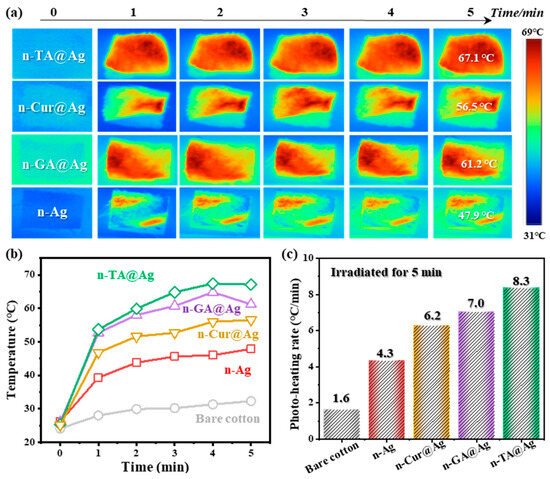 The changes in the surface temperature of fabrics were quantitatively investigated as a function of irradiation time. Figure 4b clearly shows the superior photothermal performance of n-TA@Ag, n-GA@Ag, n-Cur@Ag, n-Ag, and bare cotton, for which maximum temperatures of 67.1 °C, 61.2 °C, 56.5 °C, 47.9 °C, and 32.3 °C were achieved, respectively. This enhancement is likely due to the efficient light absorption and conversion properties of both the AgNPs and the polyphenol matrices, which promote rapid heat generation. Interestingly, n-TA@Ag possesses the maximum conversion efficiency, achieving a photo-heating rate of 8.3 °C/min over 5 min (Figure 4c). This could be explained by the typical supramolecular structure of the TA nanocoating, resulting in a thicker layer matrix with more AgNPs immobilized and enhancing the photothermal efficiency. This behavior is consistent with the hypothesis concluded from Figure 2 that the polyphenols with higher molecular weights would lead to a thicker coating matrix. Overall, this enhanced photothermal conversion efficiency is a feature that can be highly beneficial for winter wear or therapeutic applications.