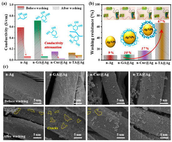 Durability is critically important in wearable electronic applications, where sustained conductivity through repeated washing is a major hurdle. To reveal the stability for practical applications, the conductivity and washing resistance of the nanocomposite coatings on cotton fabrics were tested. As shown in Figure 5a, all fabrics initially exhibited high conductivities ranging from 0.13 S/cm to 0.7 S/cm due to the incorporation of AgNPs and relatively compact coating structures. These results are in good agreement with those of high-performance AgNP coatings based on the advantages of the mirror reaction. However, after undergoing multiple wash cycles at 60 °C, the efficacy of these coatings became markedly distinct. n-TA@Ag stood out with superior conductivity retention, emphasizing the robust adhesion and stabilization effects of this particular polymeric coating. The superior performance of n-TA@Ag can be traced back to tannic acid’s unique binding capabilities and super-molecular structure, which enhance the structural integrity of the conductive pathways. In terms of stability assessments (Figure 5b), n-TA@Ag coatings demonstrate exceptional resilience against multiple washings, maintaining their conductive properties without significant degradation (67%). This outstanding performance is likely rooted in the strong interaction between polyphenols and silver nanoparticles, forming a stable conductive network, a phenomenon corroborated by previous studies on biocompatible binders [37].