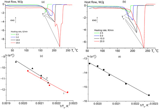 (a,b) DSC curves of PPC films recorded at various heating rates (indicated in the Figures); pristine PPC (a) and PPC after hot pressing at 130 °C (b). (c,d) Kissinger plot to determine activation energy of PPC degradation from DSC (c) and DTG (d) data; (c) pristine PPC (1) and PPC after hot pressing at 130 °C (2); (d) pristine PPC.