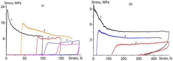 In the mechanical tests, the PPC films that had been subjected to hot pressing were used. The tests were carried out at room temperature. A clear difference between the PPC films that underwent hot pressing at different temperatures was demonstrated. Figure 9 illustrates the stress–strain curves for uniaxial stretching of films that were obtained by hot pressing at temperatures of 110, 130, and 140 °C, at different stretching rates. Uniaxial stretching of films pressed at 110 °C occurs through the formation of a well-defined local constriction on the working part and the gradual expansion of the neck, which is typical of the deformation of glassy polymers. The graph for this sample has a classical appearance: an initial linear section (the region of elastic behavior), a yield point in the form of a maximum, and then a plateau that shows the propagation of the neck. An increase in the stretching rate results in a slight increase in Young’s modulus, a significant increase in yield strength, and a decrease in tensile elongation (Figure 9a, Table 2).