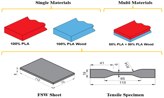 All the samples in the study were printed using Ender 3 S-1 (Creality, Shenzhen, China [24]) as single materials and multi-parts (50% PLA and 50% PLA Wood), at a 100% infill ratio, as flat in the XYZ plane, with a linear pattern, and in (45°/−45°) stacking order. Plates for FSW were prepared with dimensions of 112 × 72 × 5 mm. The layer thickness is fixed at 0.2 mm in all samples. In Figure 1, the dimensions of the tensile test specimens (ASTM D638-10 [25]) used to determine the infill ratios used in single and multi-materials, the FSW plate, and the mechanical properties are given.