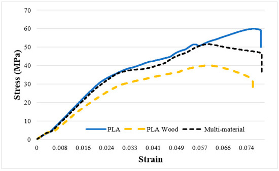 PLA, PLA Wood, and multi-material stress–strain graph.