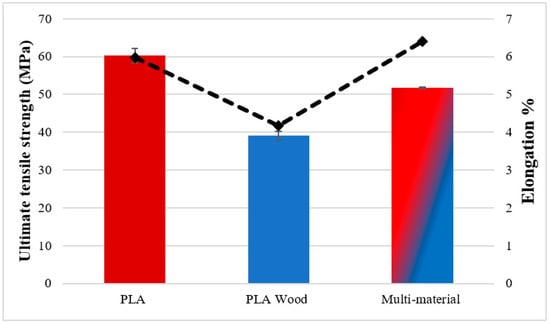 To determine the mechanical properties of the base materials (PLA, PLA Wood, and multi-material), tensile tests (Figure 3) and hardness measurements were conducted. The tensile test results showed that the tensile strengths were 60.2 ± 1.95 MPa for PLA, 39.12 ± 1.17 MPa for PLA Wood, and 51.71 ± 0.20 MPa for the multi-material. The ultimate tensile strength (UTS) values of the base materials are represented by red and blue columns in Figure 4, while the percentage elongation values are shown as a dashed line. It can be observed that PLA Wood has the lowest UTS and elongation values. The decrease in the mechanical properties of PLA Wood compared to PLA is due to the negative impact of the wood additive on adhesion between layers and the irregularities created by the wood additive [10,40]. In the multi-material, there was an improvement of 132% (for UTS) and 153% (for elongation) in UTS (51.71 ± 0.20 MPa) and elongation values (6.4 ± 0.18) compared to PLA Wood, respectively. It can be said that this situation in multi-materials is due to the good adhesion of the layers in the material transition region (contact surfaces/interface) of PLA and PLA Wood. Shore D hardness values were measured as 87.25 ± 0.95 for PLA and 72.25 ± 0.25 for PLA Wood.