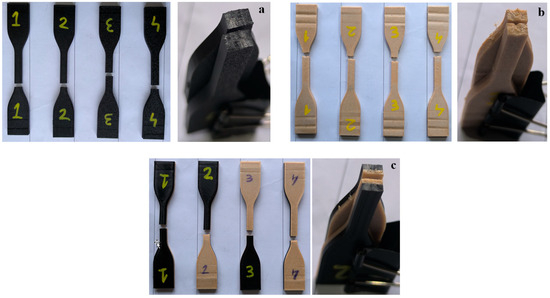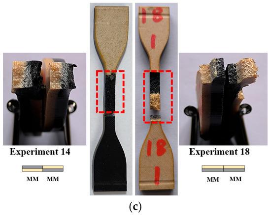 The images of the fracture surfaces of the base materials (for single-material and multi-material samples) after the tensile testing are given in Figure 5. The flat and sharp fracture shape of the PLA samples in Figure 5a shows that the tensile load follows the angle of the layer lines forming the structure of the samples [41]. In Figure 5b, the rupture in PLA Wood samples occurred on the surface perpendicular to the tensile force, and the fracture shape was indented like a reciprocal tooth mechanism. In addition, extensions that are thought to be wood particles in the filament are observed at the fracture ends of PLA Wood [40]. The fracture type of the multi-material tensile samples given in Figure 5c is similar to the fracture types of the PLA and PLA Wood materials that make up these samples (Figure 5a,b). This situation shows that the tensile load is distributed uniformly in the multi-material samples. In addition, it was observed that the multi-material tensile samples did not separate from the interface after the tensile testing. This shows that PLA and PLA Wood are compatible materials in multi-material product design and proves that their selection as multi-material was made appropriately.