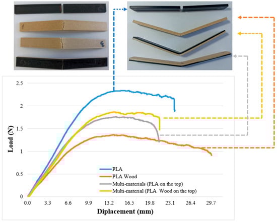 Figure 6 presents the three-point bending test graphs for the base materials. The samples prepared for the bending tests include PLA, PLA Wood, and multi-material samples. According to the three-point bending test results, the maximum bending load was determined as 103.32 ±2.5 N for PLA, 61.45 ± 1.25 N for PLA Wood, 75.81 ± 0.21 N for multi-material (PLA on top), and 81.42 ± 2.70 N for multi-material (PLA Wood on top). The highest bending load was found in PLA, while the bending loads of multi-materials were between the bending loads of PLA and PLA Wood. In multi-materials, it was determined that the material position affected the bending load. In the bending test, PLA samples broke from the point where the force was applied. In PLA Wood and multi-materials, the fracture started with a crack in the lower surface of the part, but the samples did not break completely.