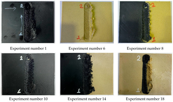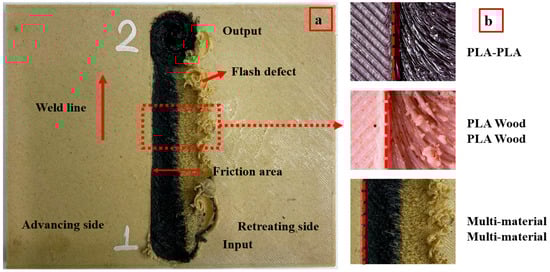 Figure 8 displays images of some samples after FSW. In all samples in the experiment, the formation of flash was observed on the retreating side. Flash occurred relatively more frequently at the tool input point. The reason for this is that the tool is left for 10 s to generate the necessary heat at the input point. It can be stated that the heat generated while keeping the tool made the material relatively more fluid, causing it to be pushed outward as the tool advanced [42]. Another defect encountered in friction stir welding is the keyhole defect that occurs at the tool entry (keyhole) and exit (exit hole) [43]. No keyhole defect was observed in this study. It was determined that exit hole defects occurred in experiments 4, 5, 6, 7, 8, 9, 13, 16, and 18. The pairs where exit hole defects did not occur were PLA–PLA and multi-material samples where PLA was on top. This can be explained by PLA being more fluid and the material around the tool filling the gap during exit.